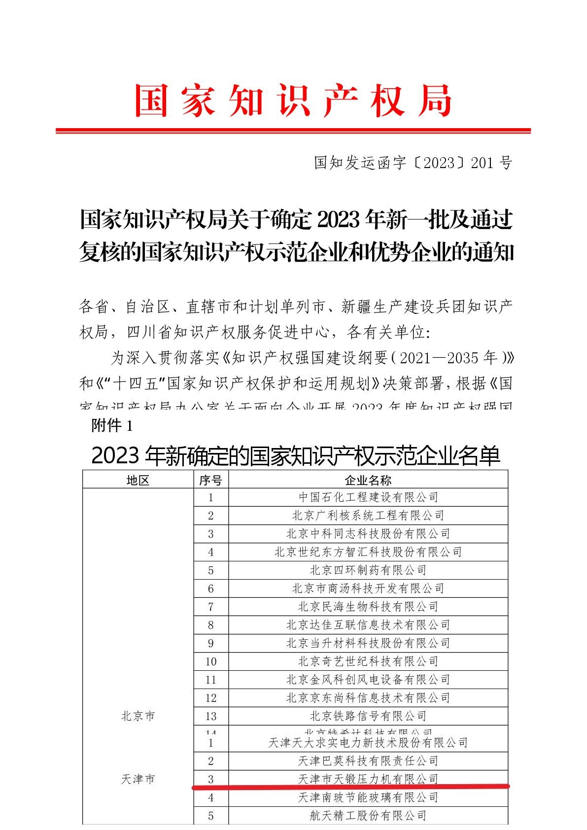 近日,國(guó)家知識(shí)產(chǎn)權(quán)局發(fā)布《國(guó)家知識(shí)產(chǎn)權(quán)局關(guān)于確定 2023 年新一批及通過復(fù)核的國(guó)家知識(shí)產(chǎn)權(quán)示范企業(yè)和優(yōu)勢(shì)企業(yè)的通知》。經(jīng)企業(yè)申報(bào)、天津市知識(shí)產(chǎn)權(quán)局推薦、國(guó)家知識(shí)產(chǎn)權(quán)局批準(zhǔn),天鍛公司成功入選2023年新確定的國(guó)家知識(shí)產(chǎn)權(quán)示范企業(yè)名單。