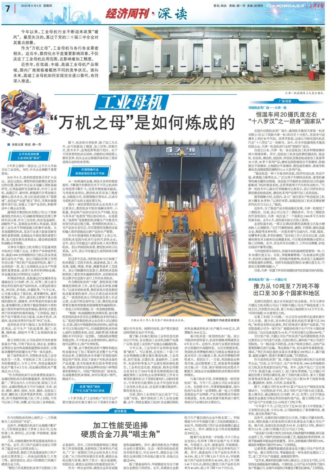 9月5日,《天津日報》“經(jīng)濟周刊”整版刊發(fā)《工業(yè)母機 “萬機之母”是如何煉成的》一文。文章聚焦“工業(yè)母機”,以政策“暖風(fēng)”扶持為切入點,展示了通用技術(shù)機床公司及其所屬天鍛公司作為中央企業(yè)被賦予的使命擔當。